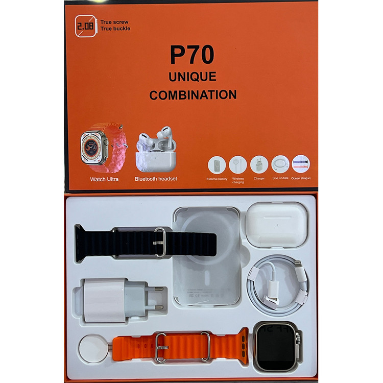 پک هدیه ساعت هوشمند مدل P70 به همراه پاور بانک وایرلس،ایرپاد نسل pro 2، آداپتور 20w و دو جفت بند اوشن
