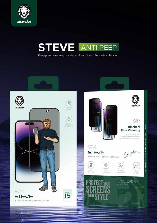 9H Steve Privacy ا IPhone 15 Pro Green Lion 9H Steve Privacy Anti-Peeping Full Glas